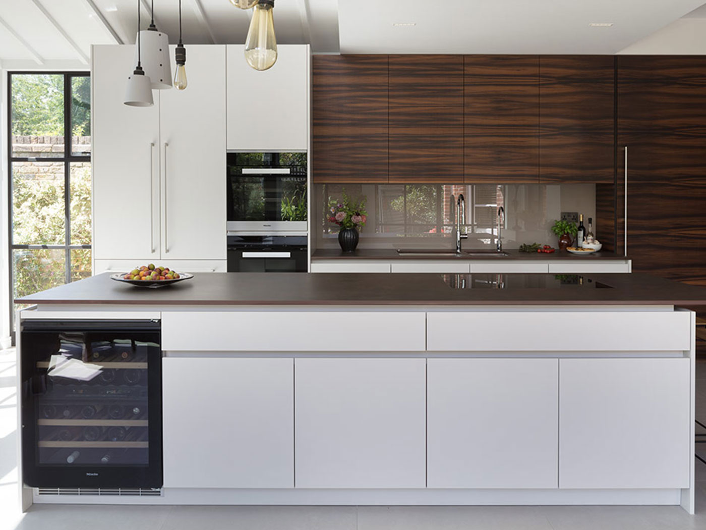 The painted matt lacquer and Riven Smoked Satin Walnut book-matched veneer brings another dimension to this uber-sleek design, with its rich, striking horizontal grain. The Urbo and Metro designs are the perfect partners for the light-infused space. The work surfaces are in super tough, yet gorgeous to look at, Dekton Keranuim, and the sophisticated island defines the kitchen from the dining space.