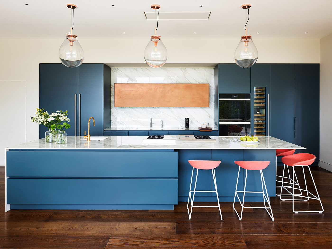 The Stephens bespoke family kitchen is a stunning combination of hand painted matt lacquer and matt sanded copper. It’s a perfect place for entertaining as it’s uncluttered – the result of a behind-the-scenes pantry that leads to a scullery and wine store. Statement materials such as this hint of copper add a sense of luxury and really bring the scheme to life.