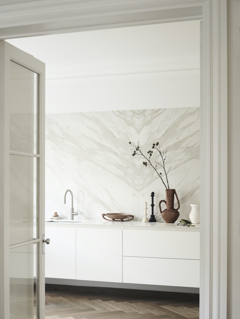 White can be used as a design tool to bring balance and help focal points feel intentional rather than overwhelming. This approach works particularly well when you want to celebrate a standout surface, whether that’s a dramatic splashback, sculptural kitchen island or statement stone. Instead of competing for attention, white creates breathing space around these elements so their natural pattern, movement and tone can be fully appreciated.