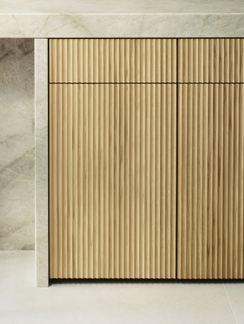 Layered textures add depth without visual noise. In Bulpitt, book-matched oak veneer, fluted timber detailing and carefully considered shadow lines create quiet interest, allowing the design to feel confident, restrained and enduring.