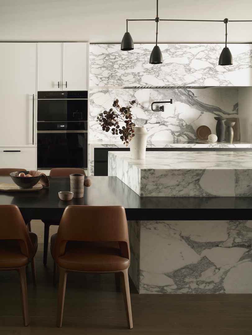 In our Kensington project, Light Arabescato Corchia marble was fabricated with 45-degree mitres so the veining wraps continuously around corners, giving the island a modular, sculptural presence. Intersecting the island with a dining table in dark custom-stained Nero Assoluto granite adds contrast and visual rhythm while cleverly zoning surfaces.